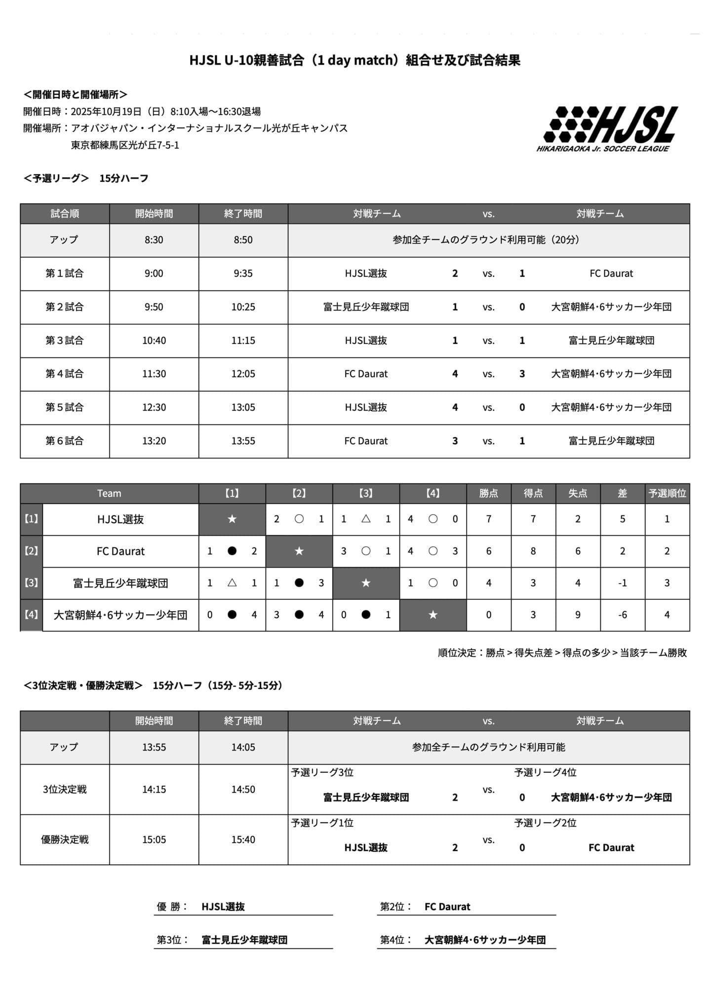 | 大会の特徴 | 夏の光が丘カップの試合結果により、各チームから選抜された選手によって行われる1デー大会。 審判員についてはHJSL加盟クラブ審判員により全試合の審判を行う。 |